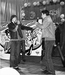Очень интересной, на мой взгляд, была генеральная репетиция перед самым концертом. КВНщики, репетируя, изо всех сил демонстрировали веселость и находчивость. Время пролетело очень незаметно, и места в зале начали постепенно заполняться. Погас свет, зазвучала музыка, и шоу началось. Со вступительным словом выступил декан ЭТФ Александр Васильевич Левшов. Он по очереди, начиная с первого курса, проверял "наличие присутствия". Оказалось, что чем старше курс, тем активнее проявляют себя студенты.
